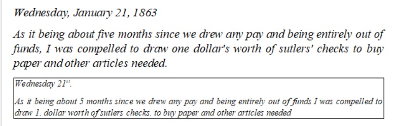 This morning the news came that Rosy had whipped old Bragg. But the news may be doubted as we have heard so many similar reports. We had dress parade and the orders were as follows: We are to drill from 7 o’clock to 8 and from 10 to 11 and from 2 to 3. At 5 o’clock we are to have dress parade. This didn’t agree with the boys, as well as many other orders would, as they have been on board so long. They feel rather lazy for the duty that’s to be done.